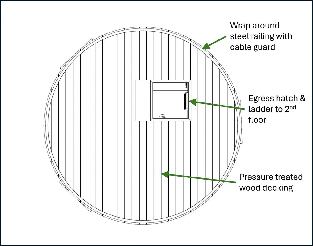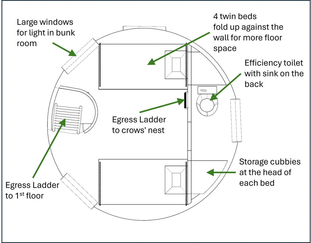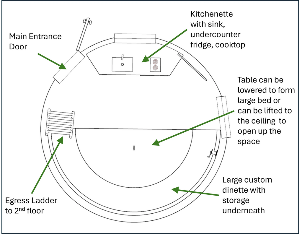 Designed to comfortably accommodate multiple guests, it features a spacious bunkhouse layout complete with a functional kitchenette for convenient meal preparation. A large custom dinette serves as the perfect gathering spot, while the crow's nest provides breathtaking panoramic views, making it an ideal space for relaxation or stargazing. Whether you’re housing extended family members, setting up an off-grid hunting cabin, or creating a magical kids' clubhouse, this eco-friendly and rustic haven adapts effortlessly to your needs.